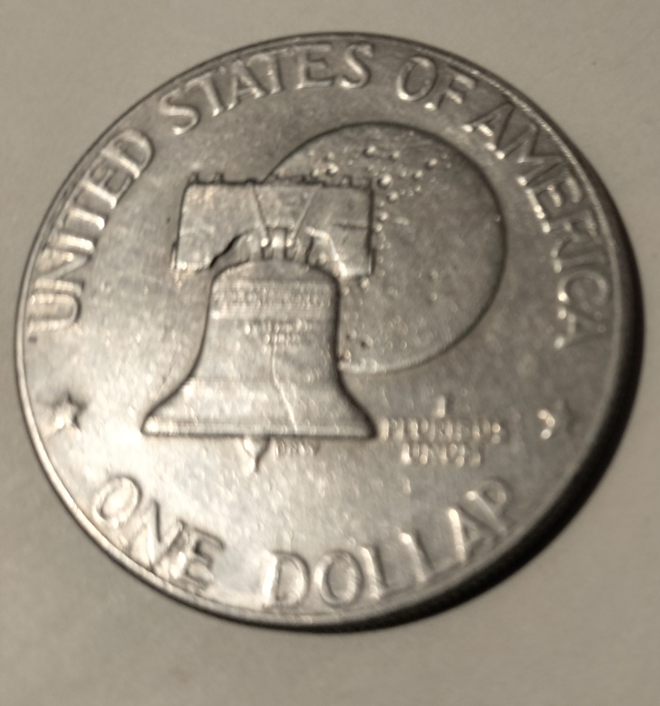 Moneda conmemorativa emitida por la Casa de La Moneda “D” Denver” de los Estados Unidos para celebrar el Bicentenario de su Independencia. Que honra tanto al presidente Dwight D. Eisenhower, así como el primer alunizaje del hombre en la luna por el diseñador Chief Engraver Frank Gasparro, cuyas iniciales aparecen en el cuello de la imagen del presidente debajo del águila. En el reverso se aprecia una adaptación de la insignia oficial del Apolo 11, en una aleación de cobre y níquel. Esta pieza corresponde a la Variedad 2, identificada por su diseño más definido y la delicadeza en la tipografía de la leyenda “STATES”**, característica buscada por coleccionistas especializados.